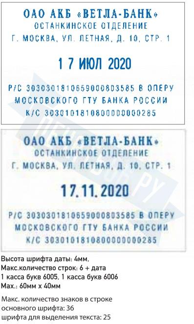 | Размер поля: 60 х 40 мм. Высота шрифта даты: 4 мм. Месяц: цифрами. Разделители: точки. |
