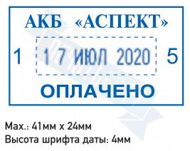 Поле: 41 х 24 мм, высота даты: 4 мм. Со встроенной окрашенной штемпельной подушкой синего цвета.