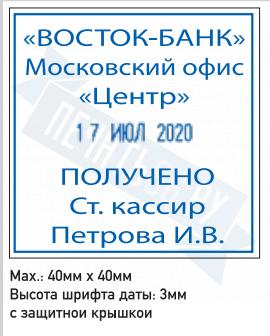 Поле: 40 х 40 мм, высота даты: 3 мм. Со встроенной окрашенной штемпельной подушкой синего цвета.