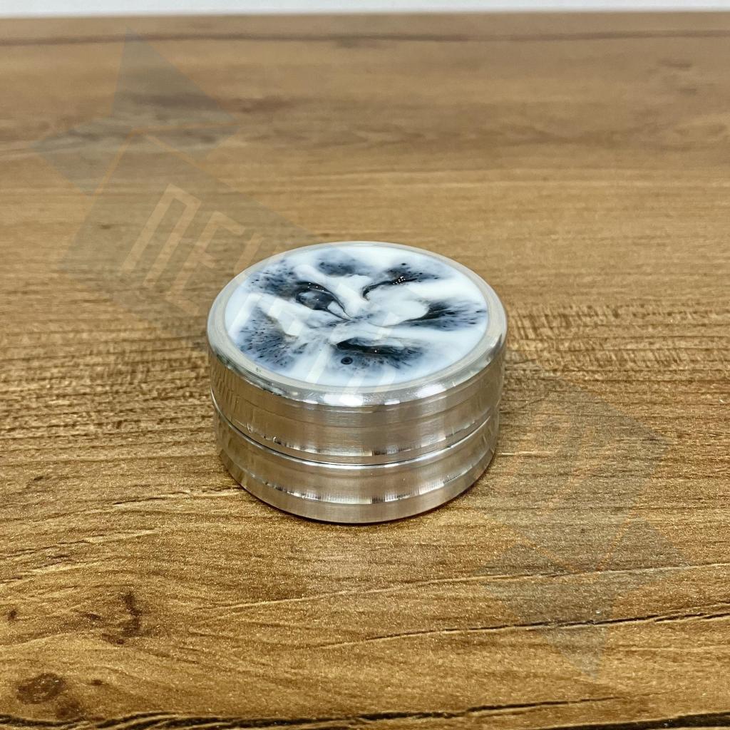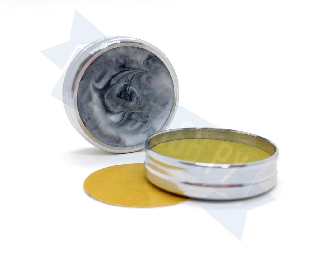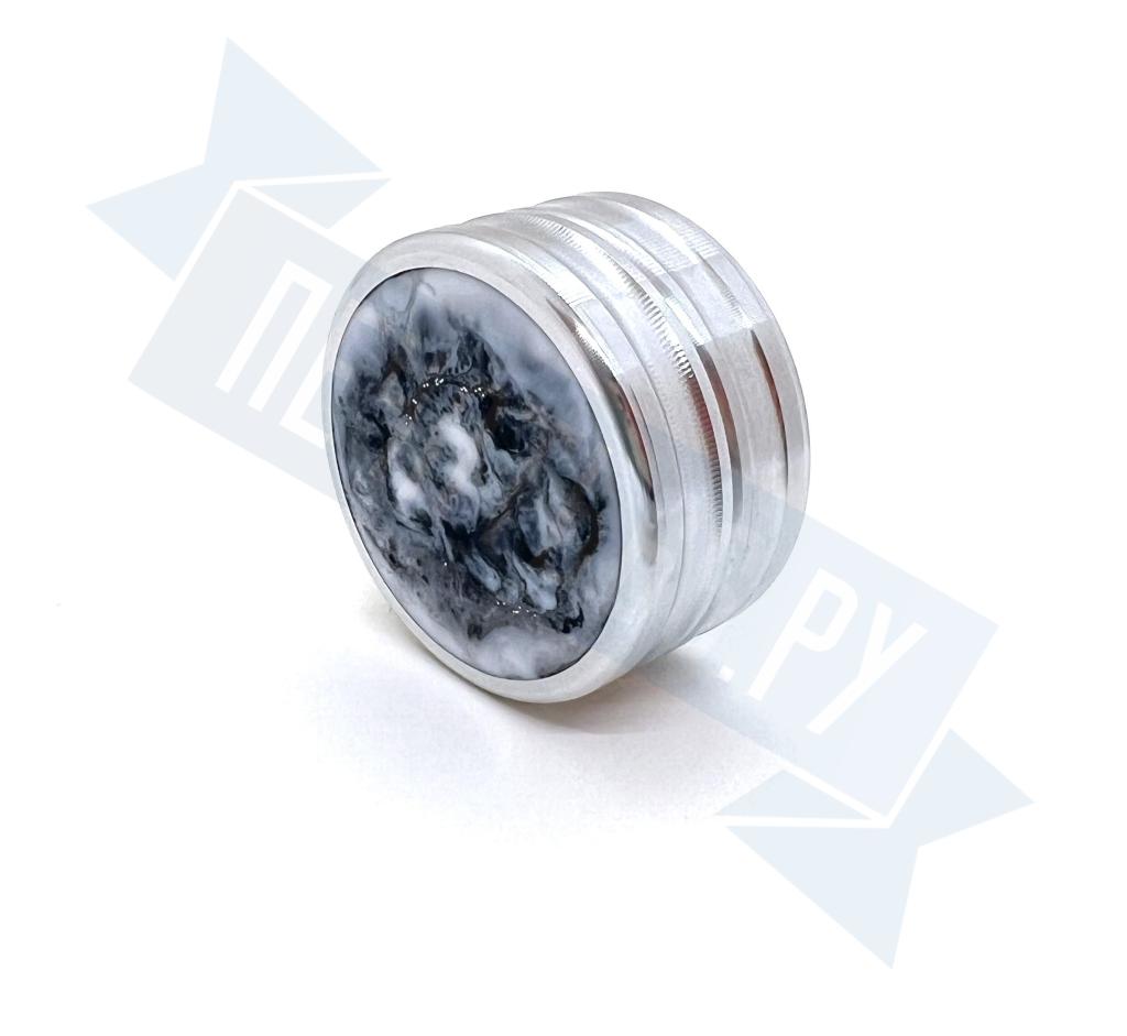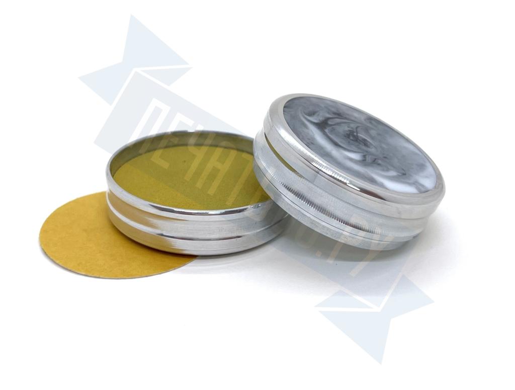 Металлическая оснастка для круглой печати со встроенной неокрашенной штемпельной подушкой. Благодаря встроенному магниту, крышку не нужно закручивать. В качестве декора на крышке и корпусе оснастки использованы вставки из акрила