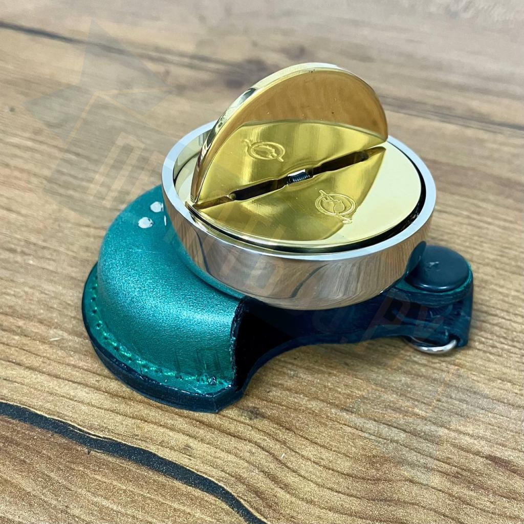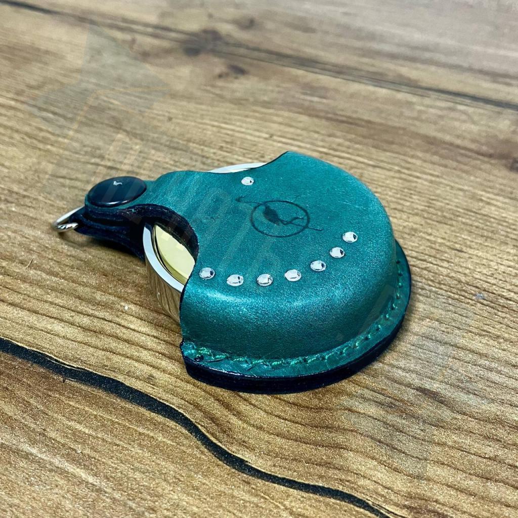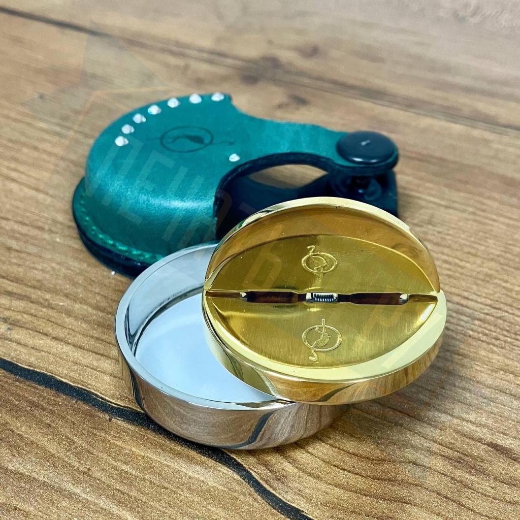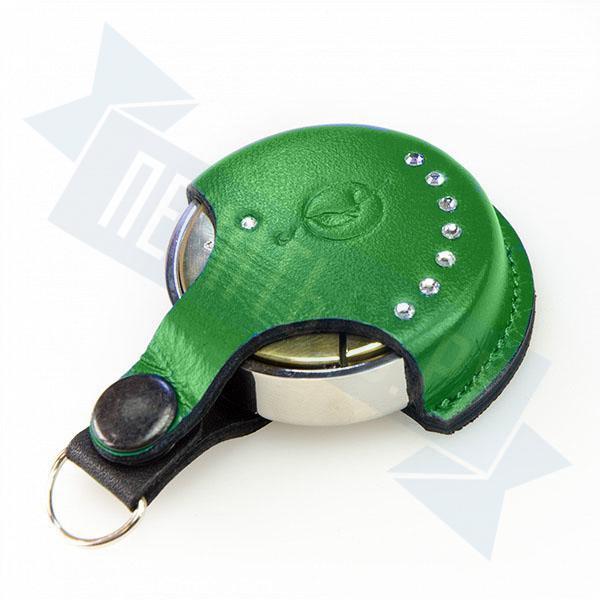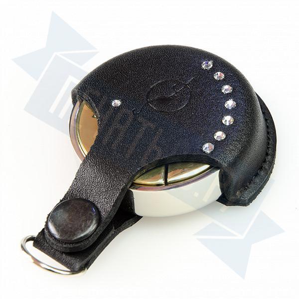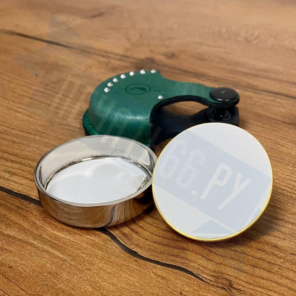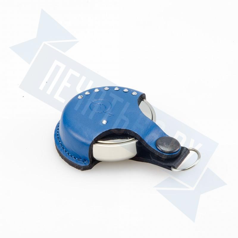 Карманная металлическая оснастка, диаметр 40мм, для круглой печати со встроенной штемпельной подушкой синего цвета, клеевым слоем для крепления клише печати. Никелированная. В комплекте чехол из натуральной кожи цвета для возможности ношения на карабине.